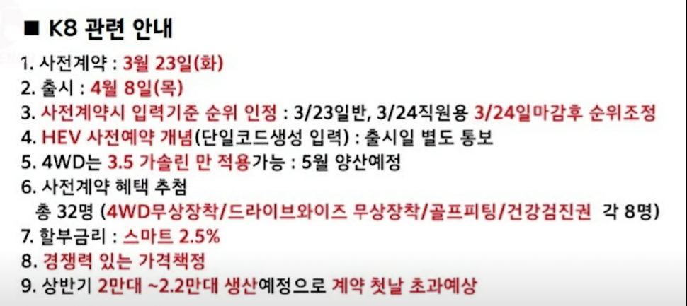 기아 관계자는 “K8 계약 첫날부터 많은 고객분들의 관심과 성원으로 사전 계약 신기록을 달성했다”며 “K8은 새로운 기아의 첫 번째 모델로서 성공적인 첫걸음을 내딛었을 뿐만 아니라 국내 세단 시장에 지각변동을 일으킬 것으로 기대한다”라고 밝혔다.