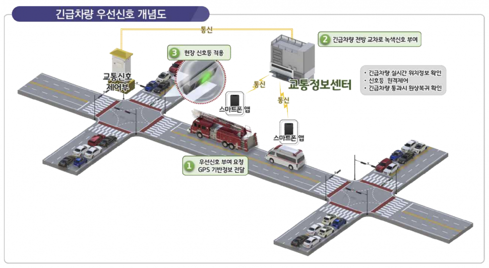 긴급차량 우선신호 시스템은 긴급차량의 목적지를 사전에 공유하고 긴급차량의 이동경로에 따라 교차로 신호를 일시적으로 제어해 우선 통행할 수 있도록 맞춤형 신호를 부여한다. 이를 통해 사고처리 시간을 단축하고 골든타임을 확보할 수 있다.