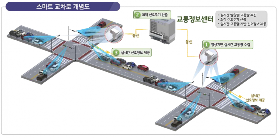 스마트 교차로 시스템은 교차로의 방향별, 차종별 정보를 추출해 생성된 빅데이터를 기반으로 최적 신호를 산출하고 실시간 반영한다. 교통량이 많은 시간대와 그렇지 않은 시간대가 큰 주요 도로의 교통흐름 개선에 효과가 있다.