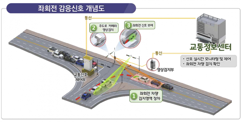 감응신호 시스템은 평상시 주도로의 통행 신호를 우선 부여하다가 부도로의 좌회전 차량을 감지한 경우 신호를 부여하는 신호체계다. 불필요한 신호 대기시간을 줄여 소통상황을 개선하고 신호위반을 줄일 수 있다.
