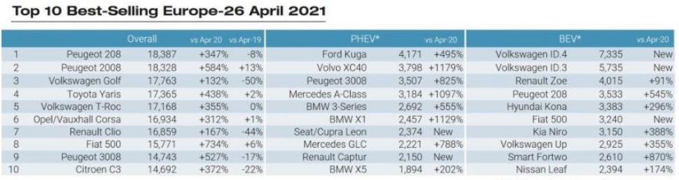 전기차 부문 1위는 폭스바겐 ID.4로 유럽시장에서 지난달 7335대를 판매했다. 이어 ID.3가 5735대 판매되며 폭스바겐의 전기차 라인업인 ID 시리즈가 선전했다.