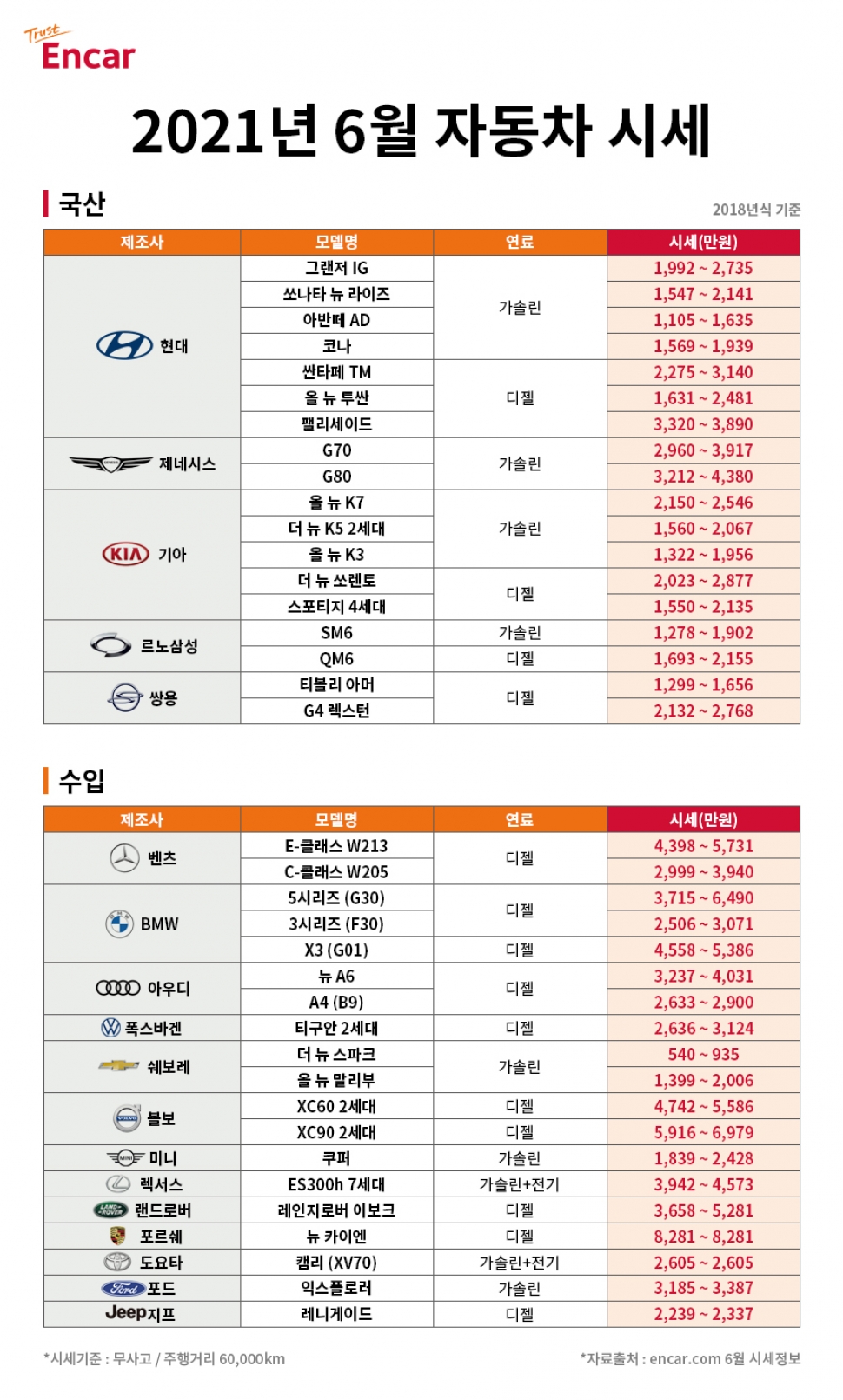 이번에 공개된 중고차 시세는 현대자동차, 기아자동차, 르노삼성, 쌍용 등 국내 완성차 브랜드와 벤츠, BMW, 아우디 등 수입차 브랜드의 2018년식 인기 차종 중고차 시세다.