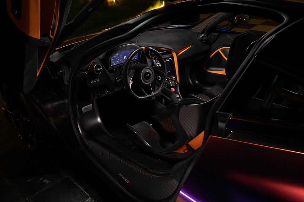 새틴 카본 파이버 재질로 마감한 실내 캐빈 공간에는 맥라렌을 상징하는 오렌지 컬러가 적용된 비스포크 도어 인스터, 스피커 서라운드, 안전벨트를 장착했다. 이 밖에도 MSO 티타늄 하네스 바와 6점식 하네스도 탑재했다.
