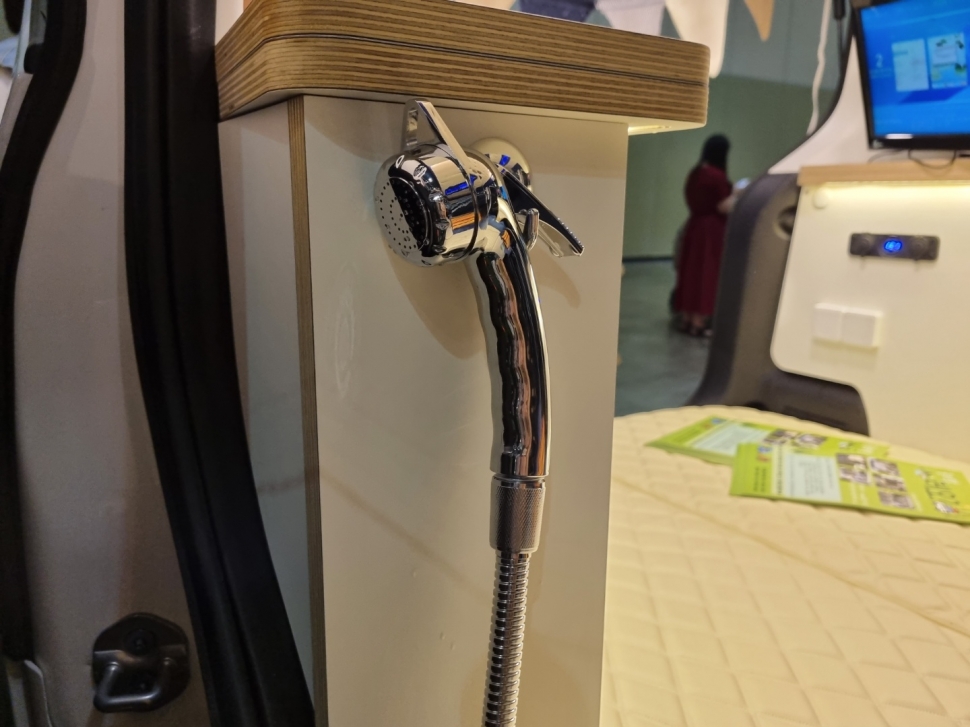‘한국상인’에서 선보인 ‘반디’는 뒷부분에 캠핑박스를 달아 전자레인지를 수납하거나 외부에서 사용할 수 있다. 리모콘으로 조명을 조절할 수 있으며 철제 모기장과 환기 팬도 장착해 쾌적함을 높였다.