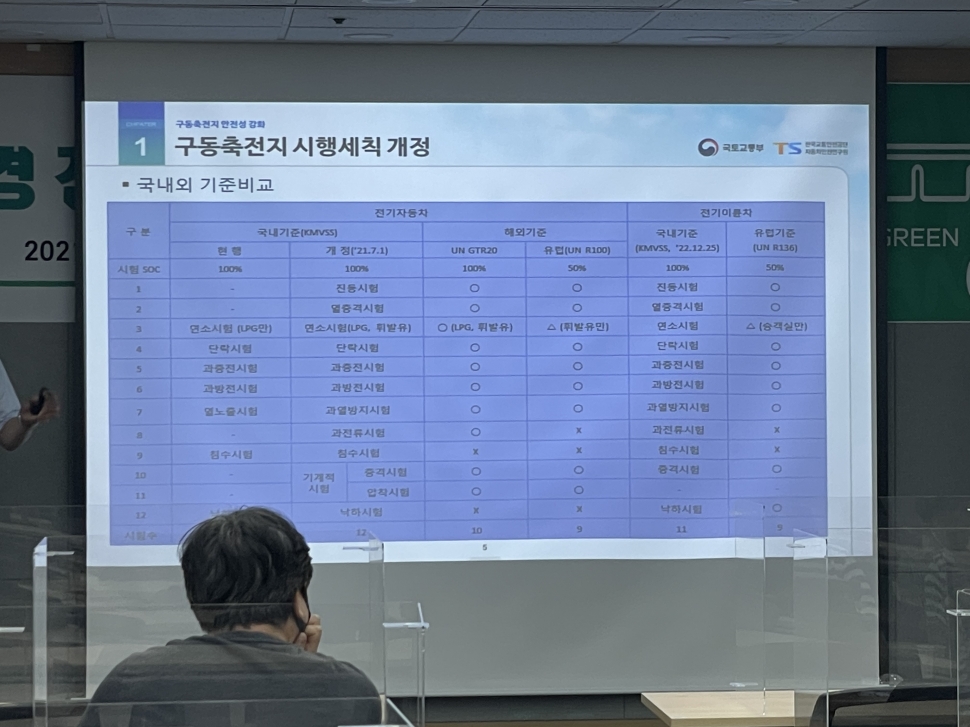 현행 배터리 안전성평가 항목은 △낙하안전시험 △액중투입안전시험 △열노출안전시험 △연소안전시험 △과충전・과방전안전시험 △단락안전시험 △고전원전기장치 안전성시험 등 총 7가지다. 4.9m 높이에서 배터리를 떨어뜨리거나 3.5% 염도의 액체에 담그고, 배터리를 2분 30초 동안 불로 직접 가열하는 등 전기차 배터리를 극한의 상태로 몰아 발화, 폭발 여부 등을 시험한다.