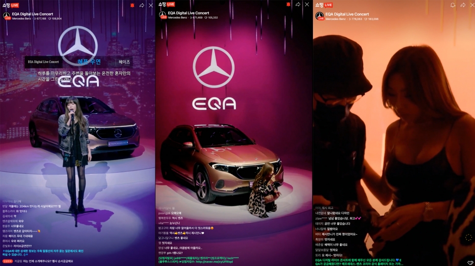 메르세데스-벤츠가 네이버 ‘쇼핑 라이브’ 서비스를 이용해 신차 EQA를 소개했다. 12일 오후 7시에 시작한 라이브는 1시간 가량 이어졌다. 무대에는 EQA가 올라왔고 라이브는 시작했지만 아무도 차를 소개하지 않았다. 3명의 가수가 무대에서 노래를 했고 시청자는 열광했다. 1시간 동안 80만 건의 조회수를 기록했다. 좋아요 버튼을 20만 명이 눌렀다.
