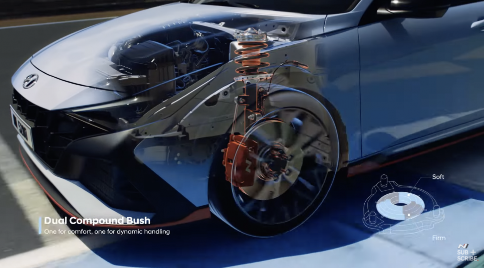 전륜 서스펜션에는 현대차 최초로 듀얼 컴파운드 인슐레이터를 적용했다. 이는 벨로스터 N 부터 적용됐던 듀얼 컴파운드 트레일링암 부시와 함께 전후∙좌우 방향 별 운동 특성을 분리해 민첩한 핸들링과 승차감, NVH 저감 등 상충되는 성능을 동시에 확보해준다.