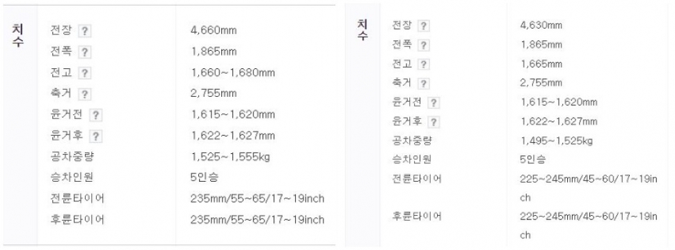 크기도 흡사하다. 스포티지는 투싼과 동일한 3세대 신규 플랫폼을 장착해 전장 4660mm, 전폭 1865mm, 전고 1660mm, 축거 2755mm의 크기를 갖췄다. 그러나 투싼은 전장 4630mm로 스포티지보다 30mm 작다.