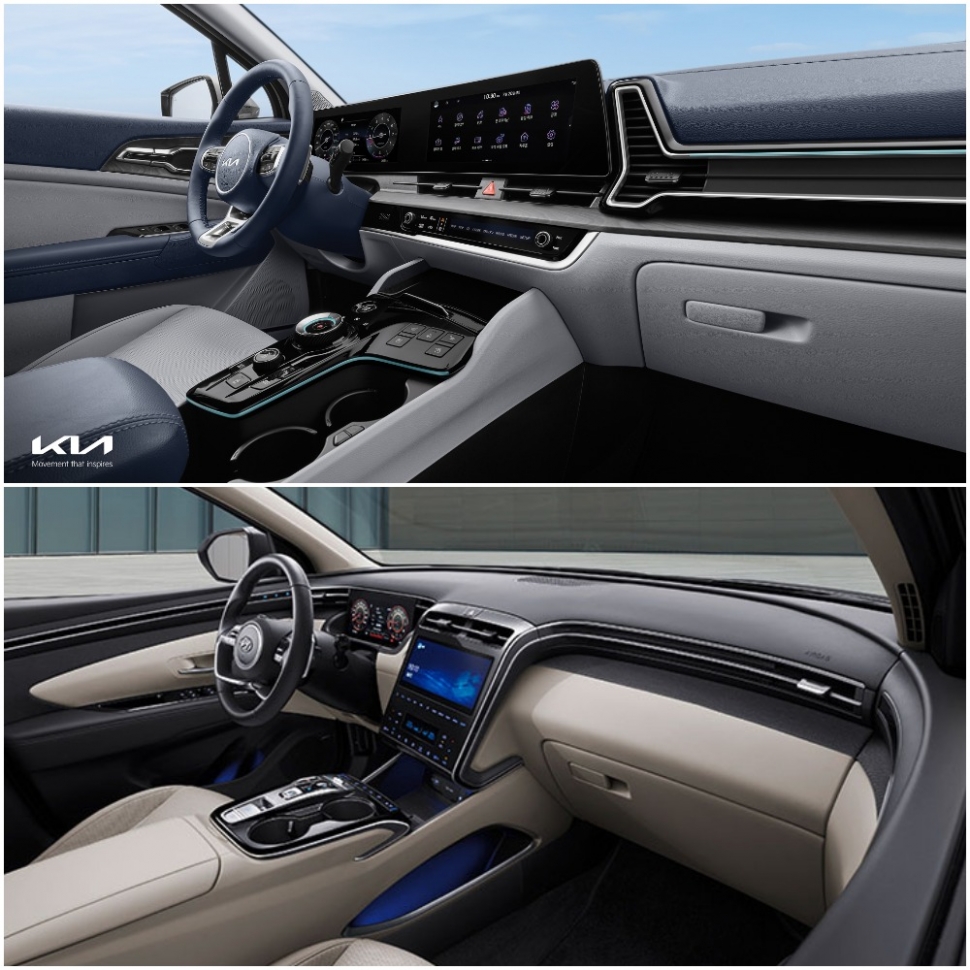 스포티지는 12.3인치 계기반과 인포테인먼트 시스템이 연결된 파노라믹 커브드 디스플레이를 장착했다. 여기에 터치방식의 전환 조작계를 탑재하고 K8 등에 탑재했던 옷걸이형 헤드레스트 등 실내 편의 사양을 대거 탑재했다. 또 두 차종 모두 전자식 변속기(SBW)를 장착했지만 스포티지는 다이얼 타입의 변속기를 투싼은 전자식 변속 버튼을 탑재했다.