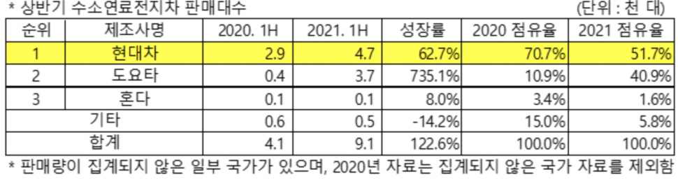 SNE 리서치 관계자는 “현대차의 점유율이 70% 내외에 달하던 압도적인 2020년 양상과는 달리 도요타와 시장을 양분하는 구도가 형성되면서 현대차가 언제든 도요타에게 다시 역전당할 수 있는 가능성을 떠안게 됐다”며 “이에 따라 현대차에게 있어 기초 경쟁력 배양 및 시장 전략 점검 등이 더욱 요구될 것으로 보인다”고 설명했다.