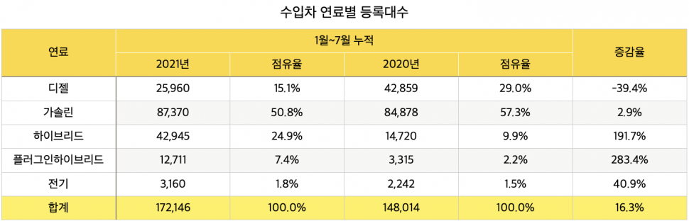 반면 디젤 모델은 수입차 시장에서 존재감을 잃고 있는 모양새다. 지난달 수입 디젤 모델은 3102대가 팔리며 지난해 같은 기간보다 44.6% 감소했다. 점유율도 전년 28.3%에서 12.7%로 대폭 감소했다. 올해 7월까지 누적으로는 총 2만5960대가 팔리며 지난해 같은 기간에 비해 39.4% 감소했다.