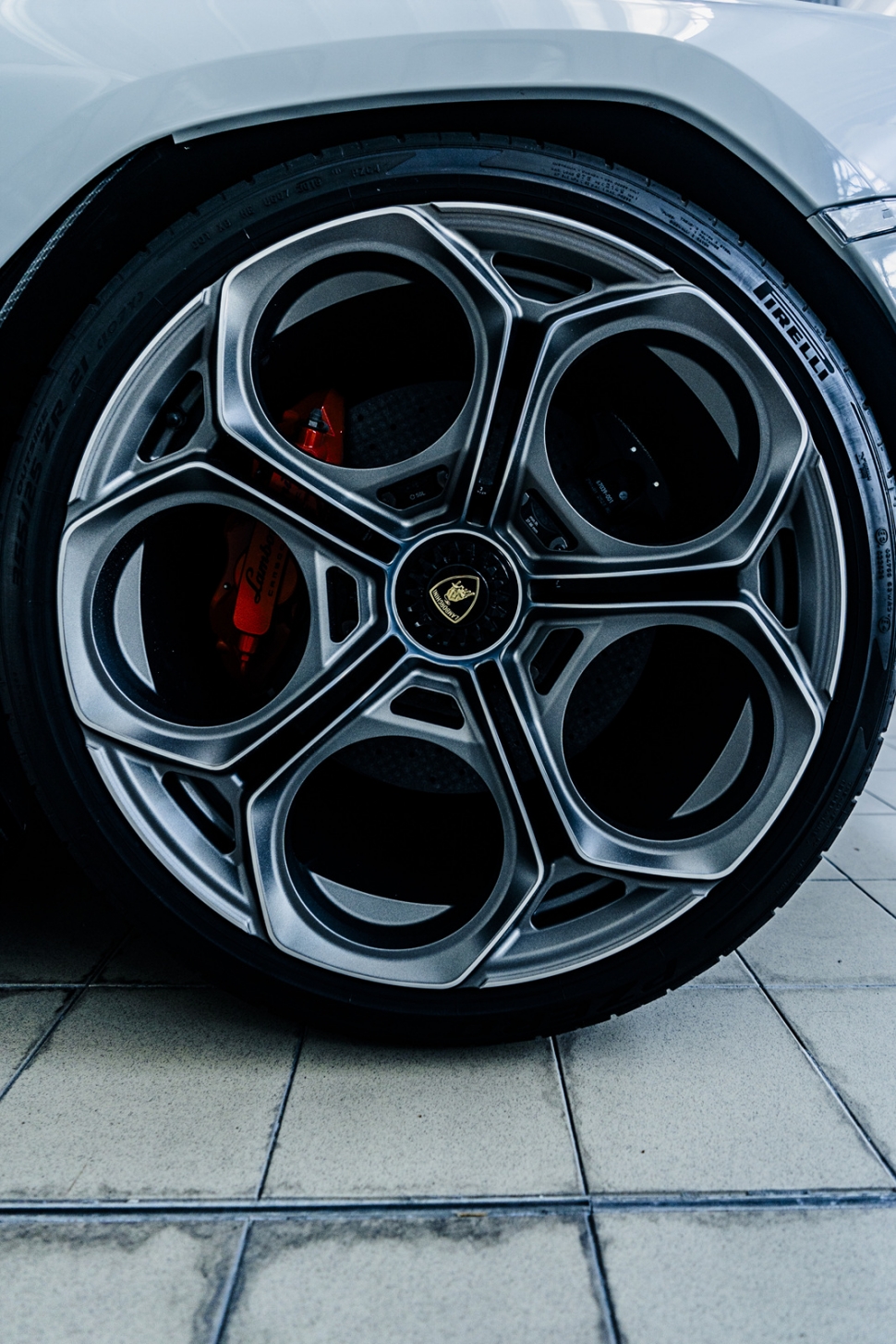1980년대 수화기의 다이얼 스타일로 제작한 20인치 프론트 휠과 21인치 리어 휠은 카본 세라믹 브레이크 디스크와 피렐리P 제로 타이어를 장착했다,