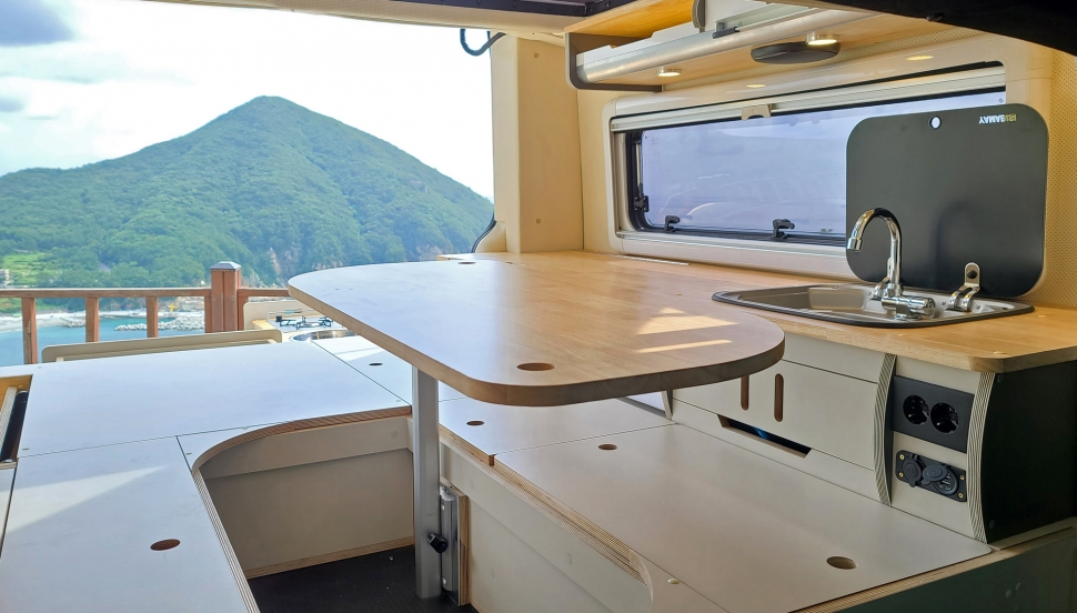 또 리어 슬라이딩 캠핑 주방세트, LED TV 외부 샤워박스, 블루투스 오디오 시스템, 어닝, 대형 쏠라 시스템, 자동 팝업 시스템 4주방식 등을 옵션으로 제공한다. 아울러 친환경 모노룸 바닥과 트리밍 작업으로 벽체를 마감하고 실내 및 트렁크 LED 조명, 방향 회전이 가능한 가변형 원목 테이블로 인테리어를 마감했다.