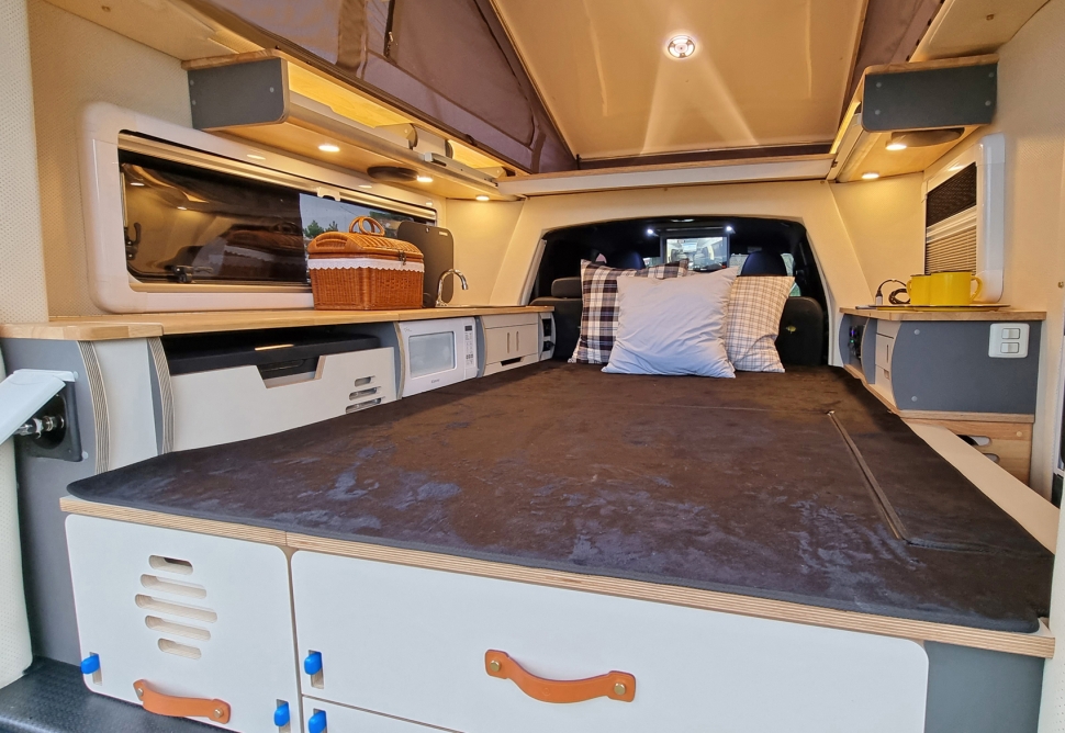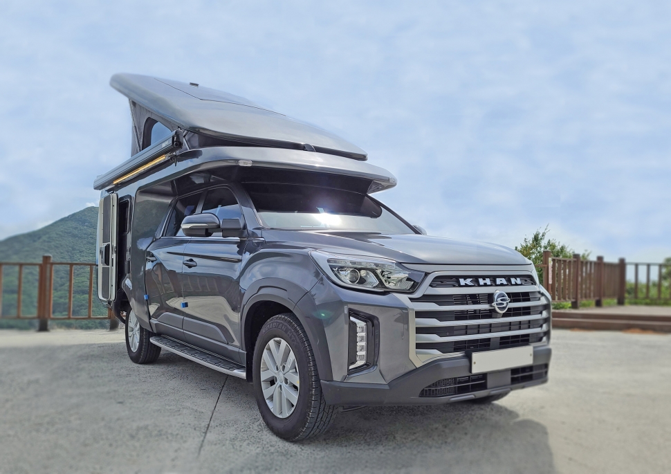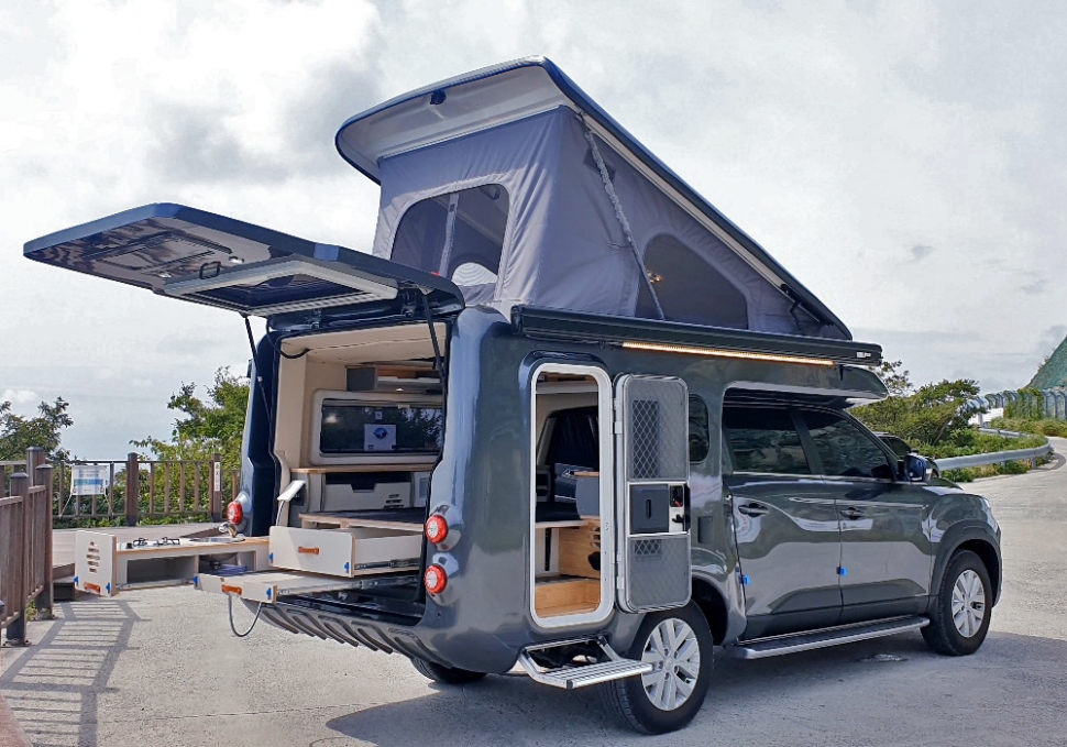 여기에 일체형 루프탑 팝업텐트 및 일체형 캠핑바디 시공을 비롯해 후면 트렁크 개방, 다용도 수납함 등을 설치해 공간 활용성을 높였다. 또 한전전기충전시스템, 주행충전기, 무시동 히터, 냉장고, 전자레인지, 프론트 주방싱크대, 강화유리 싱크볼, 전기/수전시스템 등 4인 가족이 캠핑을 즐길 수 있는 편의 장비를 기본 적용했다.