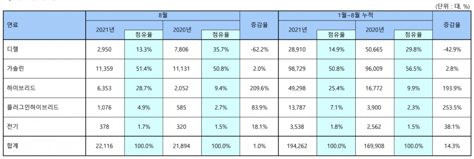 한편 KAIDA가 집계한 8월 수입 승용차 신규등록대수는 2만2116대다. 이는 지난해 같은 기간보다 1.0% 증가하고, 전달보다 9.3% 감소한 수치다. 이에 대해 KAIDA 임한규 부회장은 “8월 수입 승용차 신규등록은 일부 브랜드의 반도체 수급 난에 따른 공급부족과 물량부족 등으로 전월 대비 감소했다”라고 설명했다.