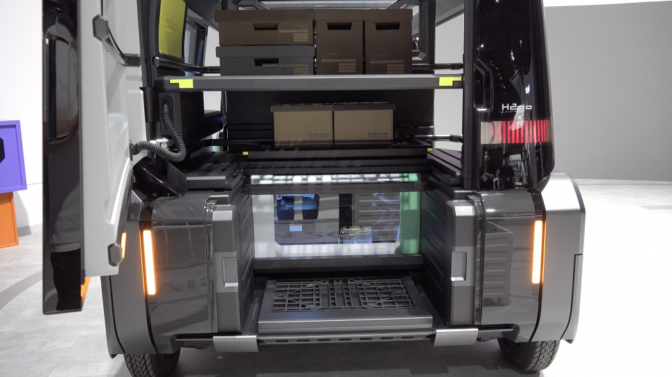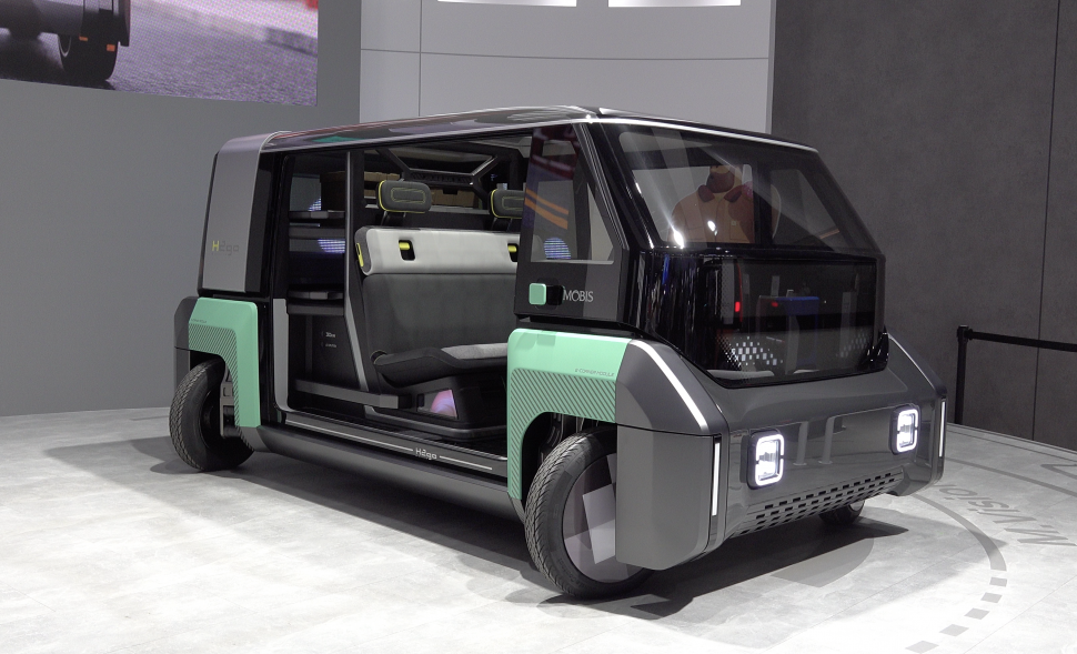 현대모비스는 도심형 근거리 딜리버리 모빌리티 ‘M.Vision 2GO’ 와 EV 기반 도심형 초소형 모빌리티 ‘M.Vision POP’을 선보였다. M.Vision 2GO는 도심 물류 운송 서비스 목적의 차량으로 트렁크 적재 공간을 확보한 것이 특징이다. 비차량용 수소연료전지 파워팩을 적용해 30kW의 출력을 발휘한다. 1회 충전으로 200km까지 주행이 가능하다. 리어/사이드 글라스에는 광고용 디스플레이를 적용할 수 있다. 리어 범퍼에는 탈착 가능한 카트를 적용해 편의성을 높였다. 내장재로는 업사이클링을 적용했다.