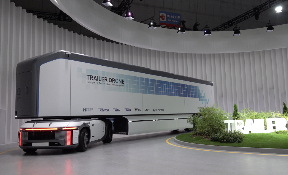 장거리 물류 운송을 위한 무인 운송 시스템 콘셉트 모빌리티 ‘트레일러 드론’을 최초로 공개했다. 전장 15.3m의 트레일러 드론은 2대의 ‘e-Bogie(이-보기)’가 앞뒤에 붙고 그 위에 트레일러를 얹은 형태다. 자율주행으로 움직이며 일반 트레일러보다 좁은 반경으로 회전할 수 있다. 운전자 거주 공간이 없는 형태로 화물 적재 능력도 높다. e-Bogie(이-보기) 전면부에 픽셀 디지털 램프를 적용해 주변 차량들과 외부 커뮤니케이션도 가능하다.