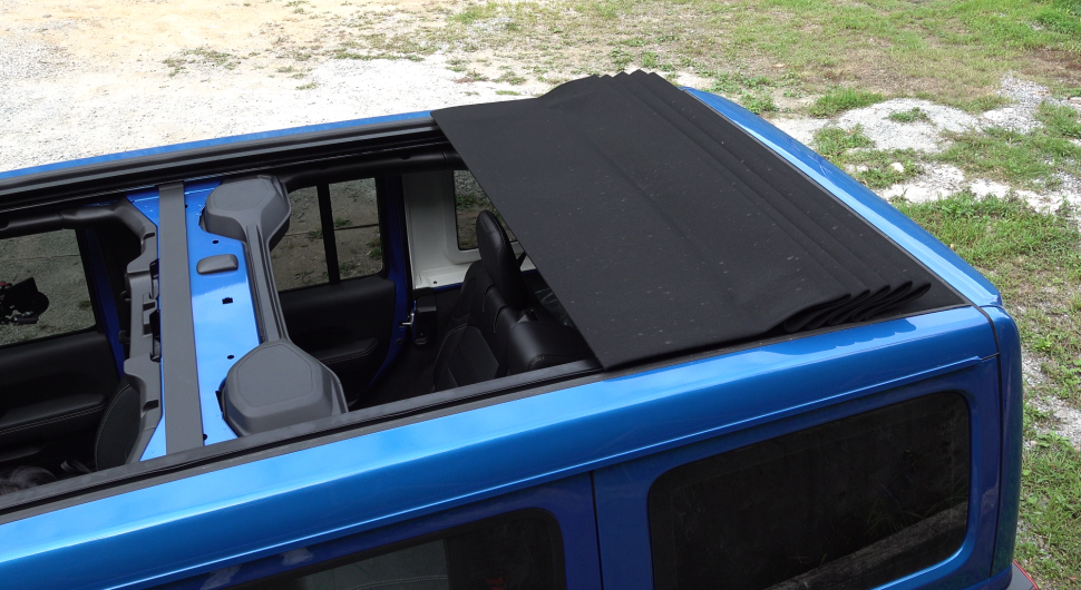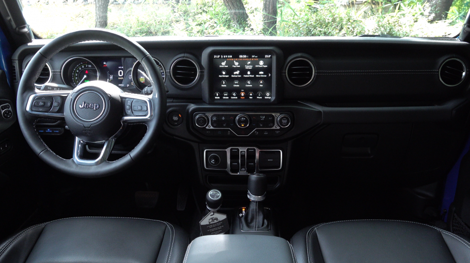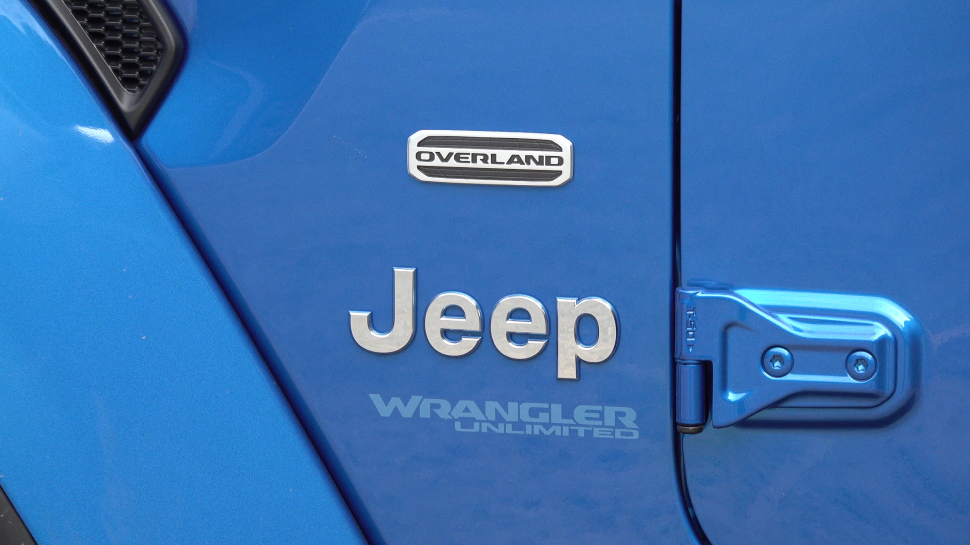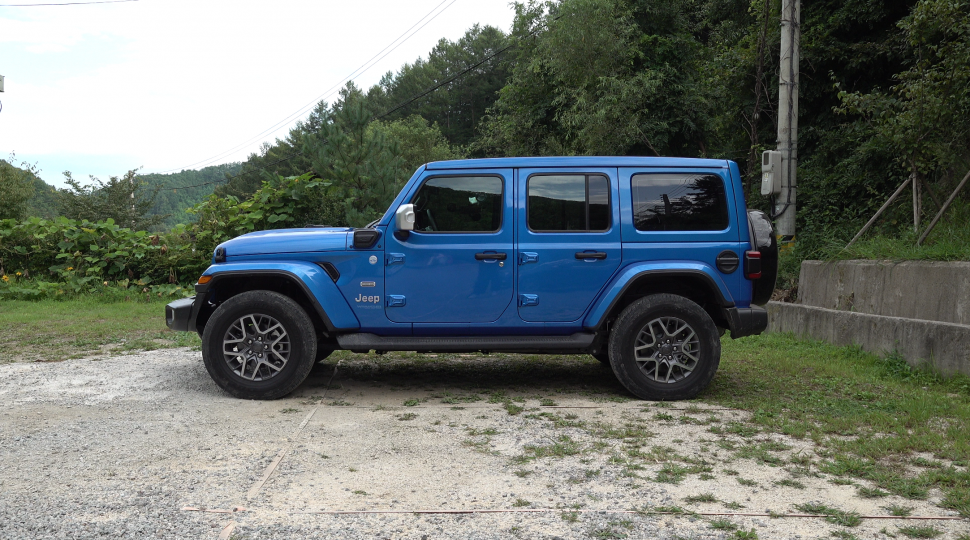 시승차는 오버랜드 파워톱 4xe로 오버랜드와 다른 점이 있다면 전동으로 캔버스톱을 열 수 있다. 플러그인하이브리드 모델이라고 해서 외관상 특별할 건 없다. 랭글러 4xe는 일렉트릭 블루라는 디자인을 전기 충전기를 꽂을 구멍이 추가될 뿐이다. 엠블럼과 네임배지 등을 보면 옆면에 파란색을 둘러 친환경차라는 것을 나타내고 있다.
