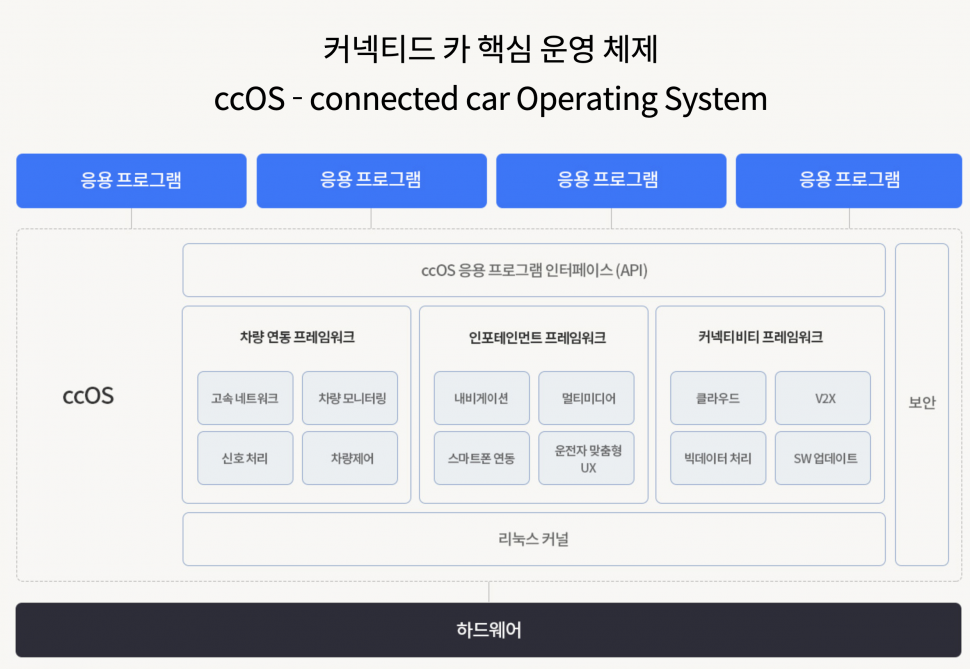 현대자동차그룹도 독자 개발 노선에 올랐다. 현대차는 인포테인먼트 시스템에 지금까지 구글 안드로이드 OS를 적용해 왔다. 최근에는 리눅스를 기반으로 자체 개발한 OS ‘ccOS’를 적용하고 있다. 제네시스 일부 차종에 이미 적용했으며, 현대차는 해당 OS를 인포테인먼트에 우선 도입한 후 내년 계기판이나 차량 제어 등 차량 전체로 확대한다는 계획이다.