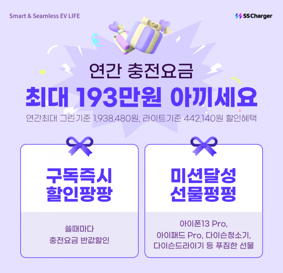 또 ‘럭키패스’ 구독 신청 회원을 대상으로 오는 12월 14일까지 누적 충전량을 취합해 충전왕을 선정하는 이벤트도 진행한다. 기간 중 통합 충전량에 따라 요금제별 누적 1위부터 3위에게 ‘아이폰 13 프로’, ‘다이슨 청소기’, ‘고프로 HERO9’을 제공한다. 또 ‘그린’은 1800kWh 누적 충전 달성, ‘라이트’는 1회 18kWh 이상 총 16회 이상 충전의 미션을 달성한 고객 전원에게 5만원 상당의 상품권을 제공한다.