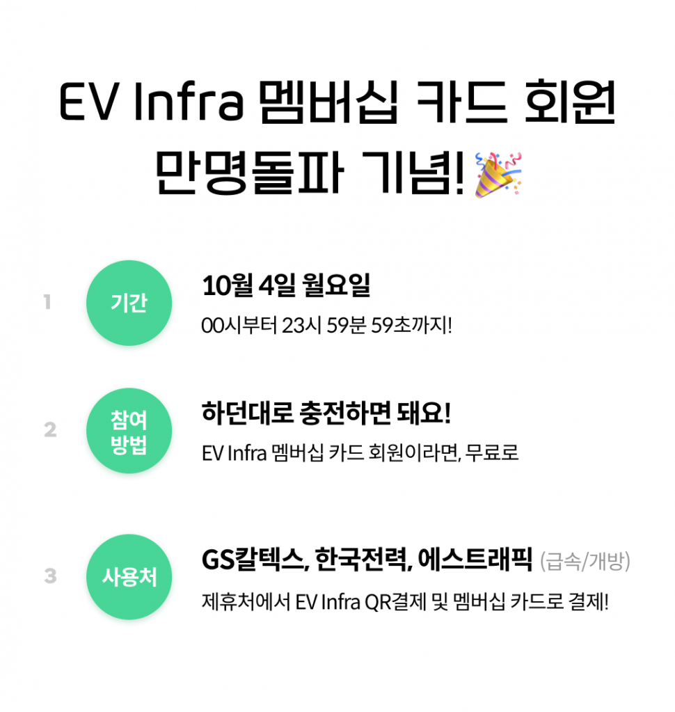 오는 4일 0시부터 23시 59분까지 하루 동안 진행되는 이번 이벤트는 EV Infra 멤버십 회원을 대상으로 회원카드 및 QR 결제를 통해 전기차를 무료로 충전할 수 있는 혜택을 제공한다. 무료 충전은 한국전력(급속), GS 칼텍스, SS차저 충전소 등 EV Infra 제휴 사업자 충전소에서 가능하다.