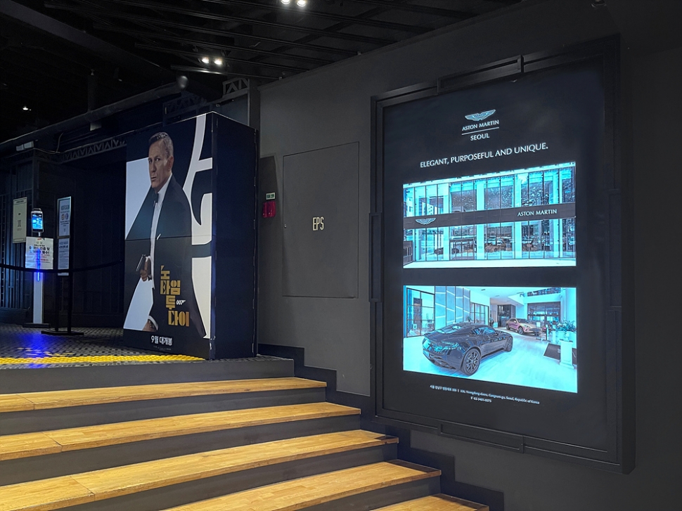 애스턴마틴 서울은 CGV 압구정, 연남, 메가박스 센트럴 등 총 3개 지점에 영화 속 본드카를 중심으로 애스턴마틴의 전통을 다양한 비주얼 작품으로 전달한다. 작품의 소재는 본드카로 활약한 애스턴마틴 모델로 스크린 광고를 포함해 극장 입구, 키오스크 등 극장 곳곳에 다양한 포스터와 브랜딩 작품을 전시한다.