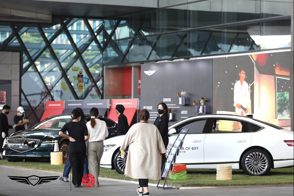 제네시스는 해운대구 센텀시티 영화의 전당 내 위치한 두레라움 광장 곳곳에서 부스 운영 및 차량을 전시하고 있다. 공식 포토월 앞에는 지난달 30일 출시한 브랜드 최초 전동화 차량 GV60을 전시 중이다. GV60은 페이스 커넥트, 지문인증 시스템, 무선 소프트웨어 업데이트 기술 등 다양한 기능을 갖췄다.