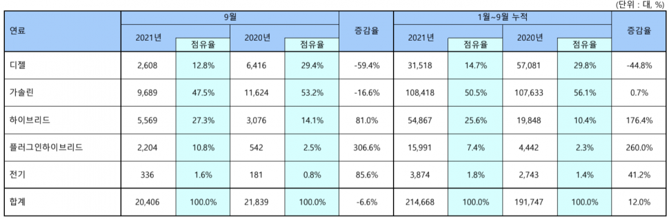 한편 한국수입자동차협회가 공개한 수입 승용차 등록대수에 따르면 올해 1월~9월 누적으로 하이브리드차 5만4867대, 플러그인하이브리드 1만5991대가 판매돼 지난해 같은 기간보다 각각 176.4%, 260.0% 급증했다. 두 모델 모두 전년보다 판매가 2배 이상 늘어난 것. 점유율로는 하이브리드 25.6%, 플러그인하이브리드 7.4%로 전체 수입차 판매량 중 33%가 하이브리드인 것으로 나타났다.