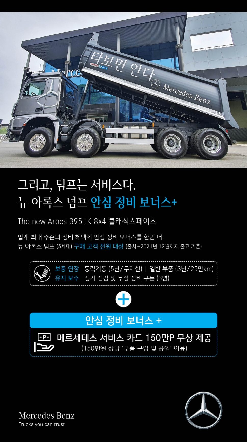 벤츠트럭의 안심케어 서비스는 동력 계통 보증 5년, 무제한 마일리지, 필수 차체, 일반 부품 보증 3년/25만km 등 업계 최대 수준의 연장 뿐 아니라 정기 점검, 유지보수 항목 관리, 긴급 출동 및 견인 서비스 지원 혜택을 제공한다. 또 유지보수 소모품 쿠폰을 기본 제공한다. 여기에 이번 안심 정비 보너스+ 혜택은 2021년 뉴 아록스 덤프를 구입한 고객 전원에게 150만원 상당의 부품 구입 및 정비가 가능한 메르세데스 서비스 카드 150만 포인트의 안심 정비 보너스를 추가로 제공한다.