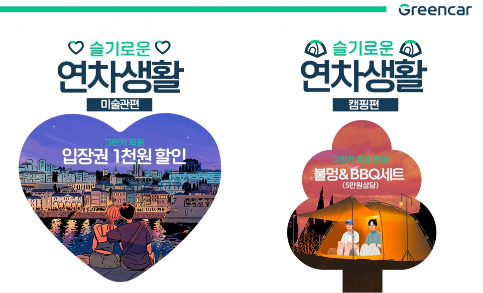 먼저 ‘그린카 타고 연차소진 캠핑 어때?’ 이벤트는 스테리움 캠핑장을 배경으로 진행한다. 그린카 공식 SNS 댓글을 통해 선발된 1등 6명에게는 스테리움 객실 패키지와 2등 10명에게는 그린카 10시간 이용 쿠폰을 제공한다. 이벤트는 오는 16일부터 21일까지 진행하며 당첨자 발표는 11월 30일이다. 추가로 스테리움 제천을 이용하는 모든 그린카 정회원은 5만원 상당의 불멍+BBQ그릴 세트를 무상으로 제공한다.