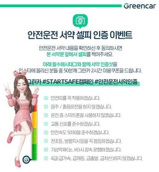 또 메타버스 플랫폼인 제페토에서 SNS 이벤트도 진행한다. 도로교통공단 ‘Start Safe 안전운전서약’ 부스 앞에서 셀피를 촬영하고 그린카 인스타그램에 응모하면 추첨을 통해 총 50명에게 그린카 2시간 이용쿠폰을 지급한다.
