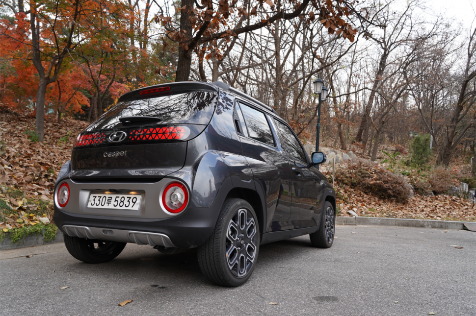 모닝과 스파크에서는 작은 차라는 강박관념이 있었는지 인상을 강하게 디자인했는데 캐스퍼는 둥근 LED 주간주행등과 무난하게 생긴 헤드램프 덕분에 귀여운 얼굴을 가졌다. 대신 옆은 부풀린 펜더와 높은 지상고로 역동성을 강조했으며 꽤나 각진 실루엣을 가지고 있다. 여느 경차와 마찬가지고 뒷문 손잡이는 윈도우 글라스 부분에 히든 타입으로 넣었다. 개인적으로 파라메트릭 패턴을 입힌 뒷모습이 인상적이다. 좌우 폭을 키운 와이드 테일램프는 보통 차체가 낮고 넓어 보이는 효과를 주지만 워낙 리어램프가 높이 달려 있고 너비도 넓지 않아 그 효과가 미미하게 다가온다.