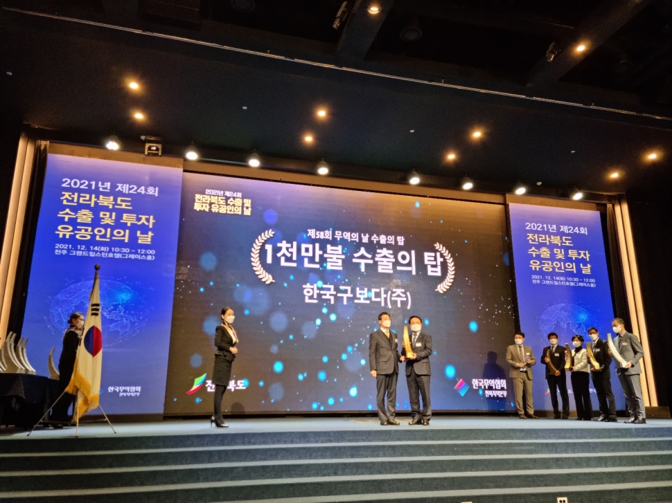 지난 2008년부터 농업 및 건설 분야에서 국내 부품업체들의 상생을 위해 국내산 부품의 해외 수출을 지속적으로 노력해온 한국구보다는 코로나19와 한일 관계 등 대내외적으로 어려운 상황 속에서 달성한 성과를 인정받아 2018년 500만불, 2019년 700만불 수출의 탑에 이어 올해 1000만불 수출의 탑을 수상했다.