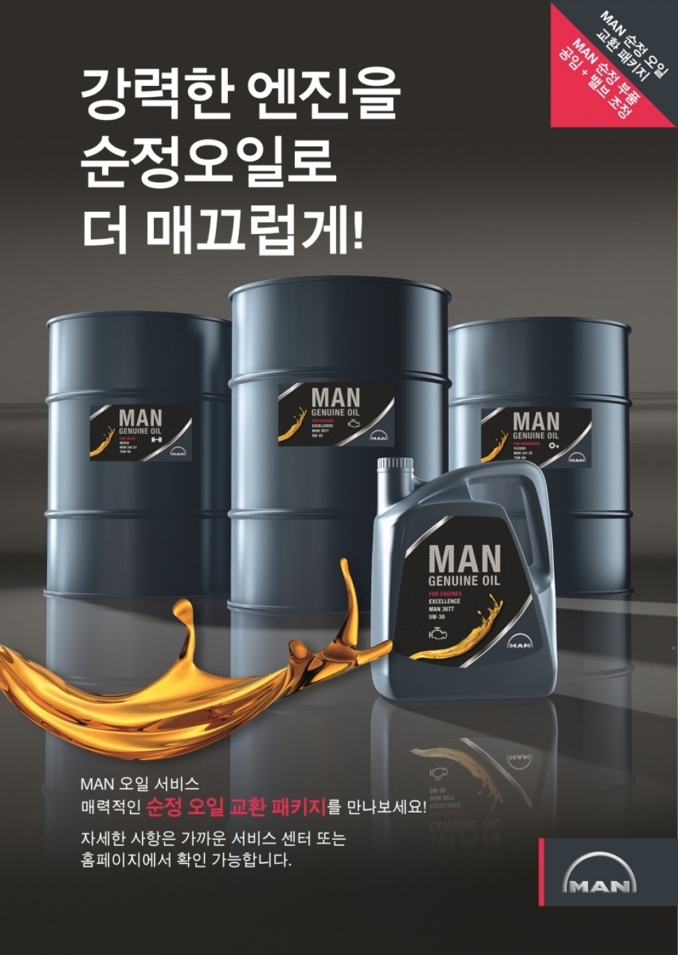 MAN 순정 엔진오일 교환 패키지는 기존의 순정 엔진 오일 교환 시 필요 부품 외에 밸브 조정 및 공임비 항목이 추가된 올 인원 형태로 구성해 정상가 대비 최대 35%의 비용 절감이 가능하다. 본 패키지는 유로 3 차량부터 유로 6D 차량까지 전 차종을 대상으로 제공되며 특히 유로 6 A, B, C 고객들은 ‘MAN & 케어’ 패키지를 활용하면 이중 혜택을 받을 수 있다.