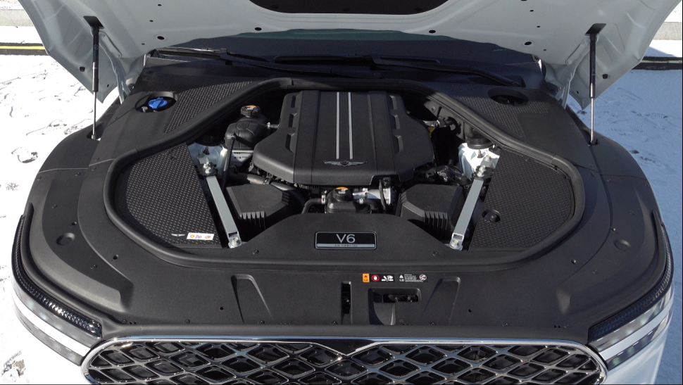 시승차엔 3.5리터 터보 엔진이 들어간다. 이전에 있었던 3.3리터 터보 엔진과 3.8리터 터보 엔진 5.0리터 자연흡기 엔진은 이제 G90에서 만날 수 없다. 신형 G90엔 이제 일반 모델에서는 3.5리터 터보 엔진을, 그리고 롱휠베이스 모델에서는 48V 마일드 하이브리드 시스템이 곁들어진 3.5리터 터보 엔진이 들어간다. 3.5리터 터보 엔진은 최고출력 380마력(5800rpm), 최대토크 54.0kg·m(1300~4500rpm)를 발휘한다. 여기에 8단 자동변속기가 짝을 맞추며 네 바퀴를 모두 굴린다.
