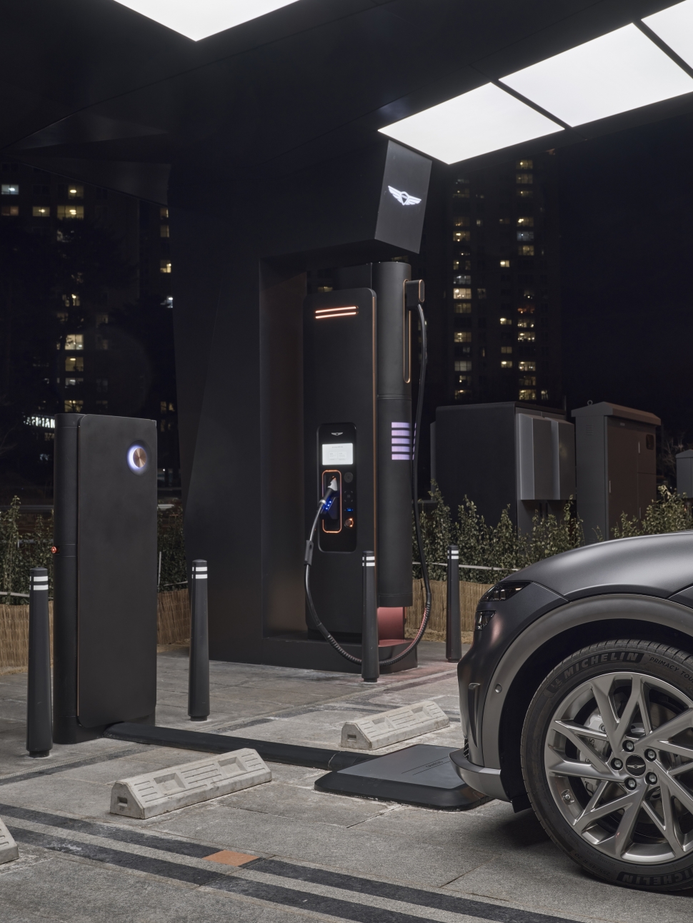 또한 무선충전 서비스 상용화에 앞서 사업성 검증을 위한 시범 사업을 진행한다. 제네시스 디자인 정체성이 반영된 무선 충전기는 바닥에 설치된 충전 패드 위에 차량을 주차하는 것만으로도 전기차 충전이 가능한 기술이다. 충전 성능은 11kW로 GV60 기준(77.4kWh), 약 8시간이 소요되며 현재 제네시스 전기차 고객에게 공급중인 유선 홈 충전기와 유사한 속도이다.
