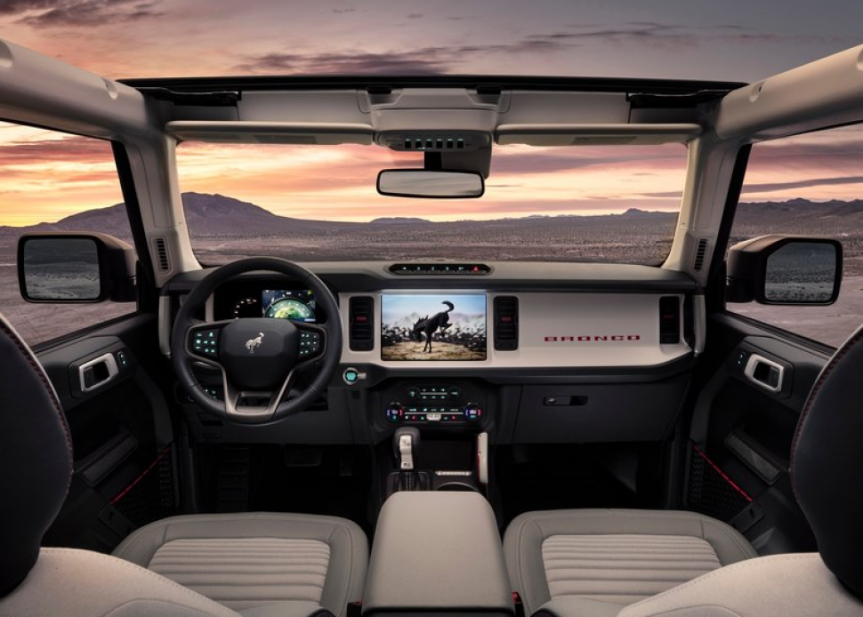 반면 실내는 친숙한 디자인에 포드의 최신 인테리어가 적용됐다. 대시보드는 오리지널 브롱코의 느낌을 잘 살려서 아주 평평한데 포드의 최신 인포테인먼트 시스템인 SYNC4를 지원하는 12인치 디스플레이스를 가운데 배치했다. 이젠 계기판도 디지털 디스플레이가 들어간다.