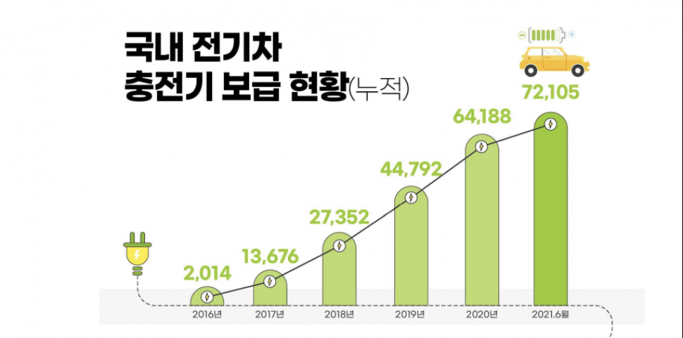 지난 2일 국토교통부에 따르면 2021년 말 등록된 전기차는 전년대비 71.5% 증가한 9만6481대로 집계했다. 이를 더하면 국내에 등록된 누적 전기차는 총 23만1443대로 2018년 말 대비 약 4.2배 증가했다. 이러한 추세에 맞춰 전기차 충전기 보급을 늘리고 있으나 늘어나는 수요를 감당하기엔 역부족이다.