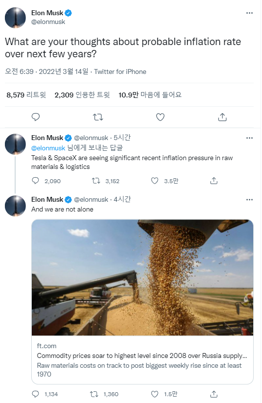 Tags :  일론머스크  테슬라  스페이스X  인플레이션  자동차원자재  러시아전쟁