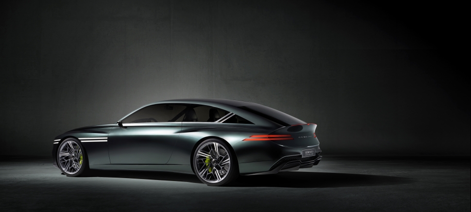 콘셉트 모델을 위에서 내려다봤을 때 가장 눈에 띄는 디자인 요소는 모래시계 실루엣을 적용한 스타일링이다. 굴곡이 들어간 휠 아치 부분이 마치 근육이 있는 듯한 이미지를 연출한다. 또 하나의 대표적인 제네시스 디자인 특징 중 하나인 파라볼릭 라인은 후드에서 시작해 후면부 끝까지 이어지며 클래식카를 연상케 하는 원만한 곡선을 이룬다.