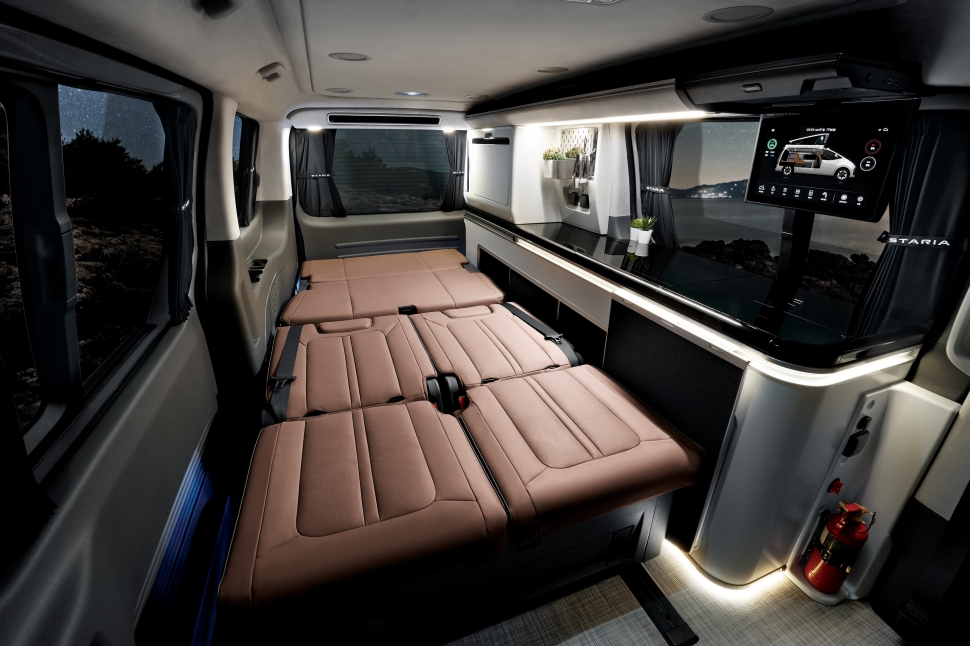 캠퍼의 전동식 팝업루프는 곡선을 통해 공기역학적인 디자인을 적용하고 차체와 동일한 소재를 사용해 일체감을 준다. 또 루프를 위로 들어 올리면 성인 2명이 취침할 수 있는 공간으로 활용 가능하며 실내 램프와 매트리스를 넣었다.