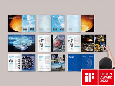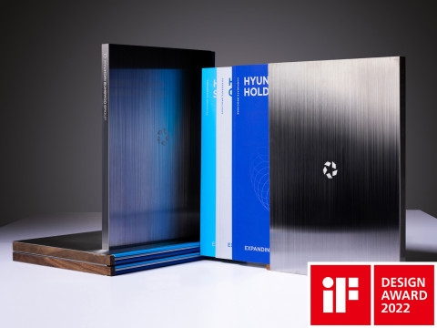 브로슈어 패키지는 그룹의 모태인 자동차 부품산업을 상징하는 메탈 계열의 알루미늄 스틸로 제작해 그룹의 역사와 미래의 연결성을 담았다. 사업의 특징을 정확히 보여주는 현장감 있는 사진과 그룹의 심볼마크 색상인 남색, 하늘색, 회색을 사용해 기업 정체성 및 통일성을 반영했다.