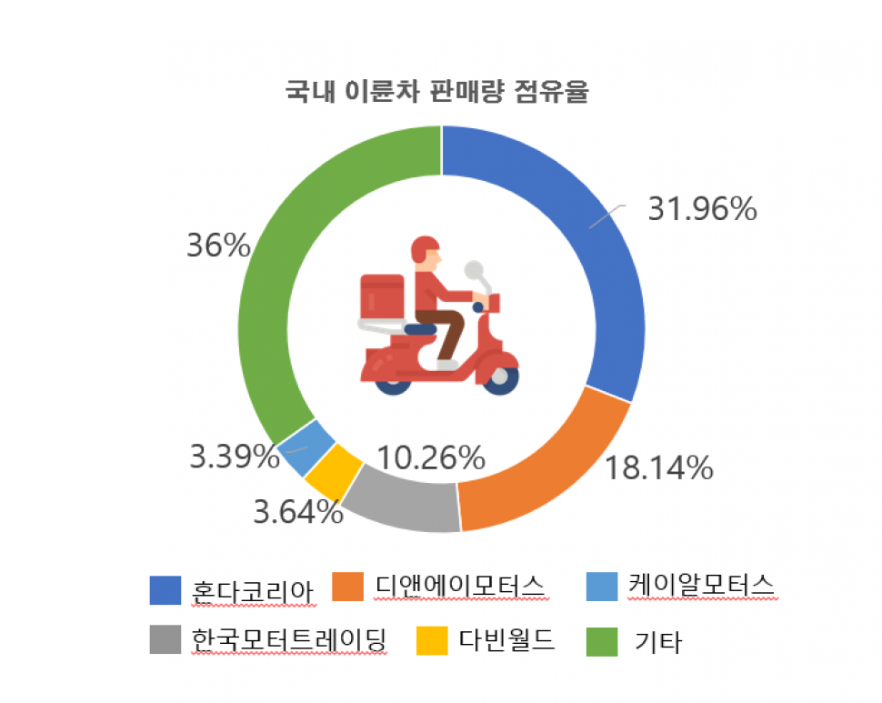 2021년의 브랜드별 연간 판매량 순위를 살펴봐도 일본 이륜차의 독주는 계속된다. 혼다, 야마하를 비롯한 주요 일본 브랜드의 점유율은 약 44.66%를 기록했다. 반면 국산 브랜드의 이륜차는 21.53%에 그쳤다. 국내 판매량 상위 탑 5개 브랜드를 살펴보면 1위는 혼다코리아로 31.96%, 2위인 디앤에이모터스는 18.14%, 3위 한국모터트레이딩은 10.26%, 이어 다빈월드 3.64%, 케이알모터스 주식회사 3.39% 순이었다.