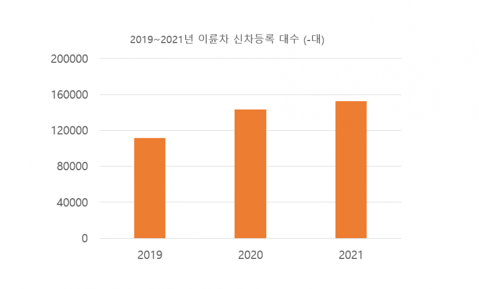 오토캐스트가 국토교통부에서 정보공개 청구를 통해 확인한 자료에 따르면 2019~2021년의 이륜차 신차 등록은 가파르게 증가했다. 코로나19 확산 전인 2019년에는 총 11만1698대의 이륜차가 등록했지만 코로나19 상황이 시작된 2020년에는 14만3038대, 2021년에는 15만2623대를 기록했다. 각각 2019년 대비 약 28.05%, 30.63% 증가한 수치다. 즉, 코로나19로 인해 이륜차의 신차 수요가 폭증했고 30% 증가 수준을 기록한 것.