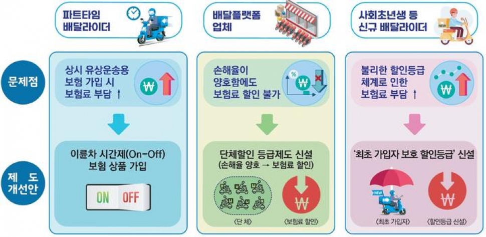 대통령직인수위원회도 지난달 시간제로 보험을 활성화하는 배달이륜차 종합대책을 공개했다. 파트타임 라이더의 경우 상대적으로 저렴한 가정용 이륜차 보험에 가입한 뒤 실제 배달한 업무시간에만 보험료를 부담하게 하는 것이다. 또 배달 플랫폼 업체는 소속 이륜차의 손해율이 양호하면 보험료를 할인해주며 보험료 부담이 높은 신규 라이더들에게는 최초 가입자를 대상으로 할인등급을 산정하는 최초 가입자 보호할인 등급을 신설함으로써 보험료 부담을 낮추겠다는 계획이다.