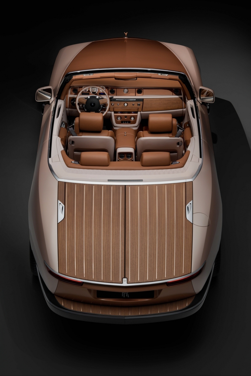 차량 전면부에는 단일 알루미늄으로 제작된 판테온 그릴과 로즈 골드로 만들어진 환희의 여신상이 자리잡았다. 보닛은 오직 이번 보트 테일을 위해 특별 개발된 코냑(Cognac) 색상으로 도색했으며 미세한 구리색 및 금색 운모 조각과 크리스탈 및 아이스 무광 클리어 코트로 마감했다. 하단부 역시 로즈 골드 테크니컬 파이버 소재로 제작했다.