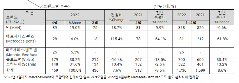한편 KAIDA 관계자는 "메르세데스-벤츠 밴의 국내 사업권이 4월부터 다임러트럭 코리아에서 메르세데스-벤츠 코리아로 양도됨에 따라 별도 분리해 집계한다"고 밝혔다.