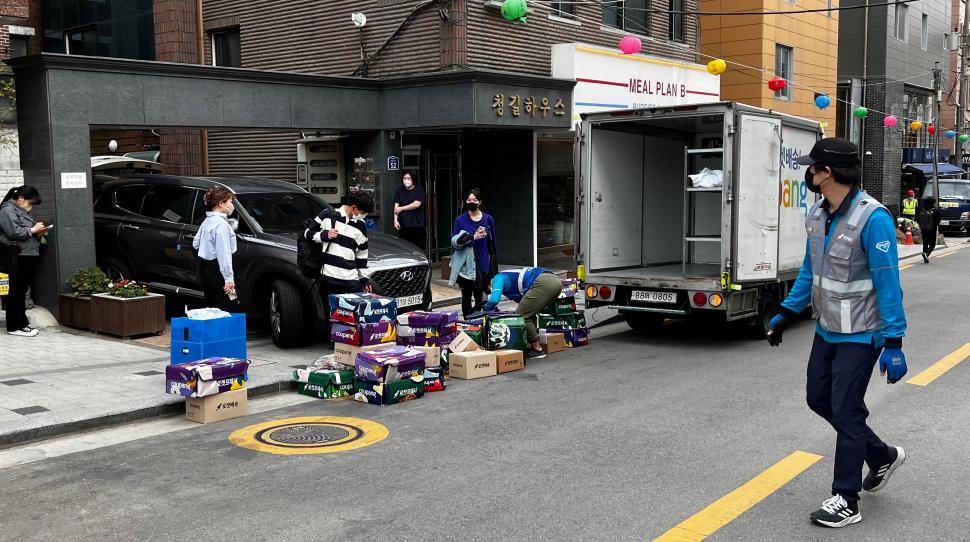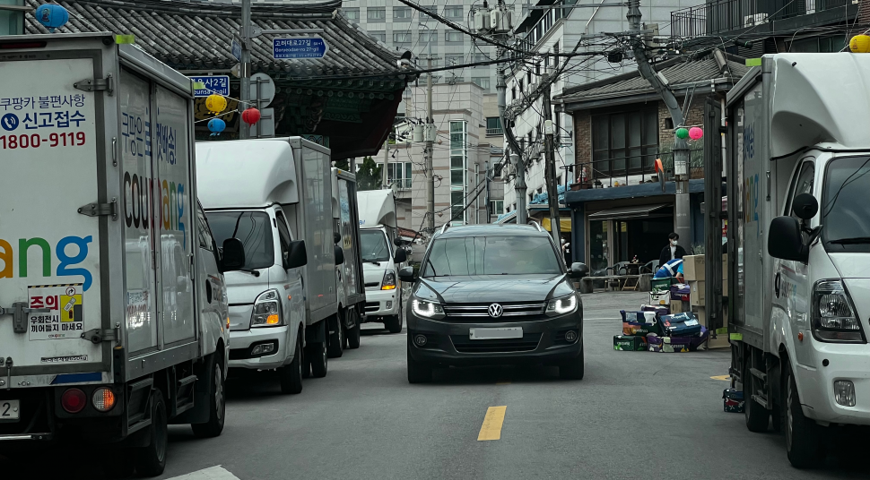 실제로 이 골목에서는 비슷한 시간에 2대에서 5대의 쿠팡 배달차가 모여 길바닥에 물건을 던져놓고 재분류하는 모습을 볼 수 있었다. 1톤 트럭 2대에서 5대 분량의 배달 물품을 모두 꺼냈다가 다시 넣는 작업이다.