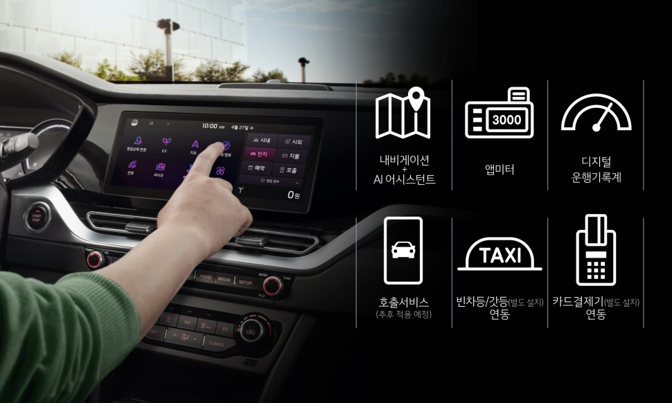 택시 모델은 택시 영업에 필요한 다양한 기능을 통합 제공하는 올인원 디스플레이와, 슬림형 헤드레스트, 워크인 디바이스, C타입 USB단자, 2열 시트벨트 버클 조명, B필라 어시스트 핸들 등 2열 승객을 위한 편의사양을 갖췄다.