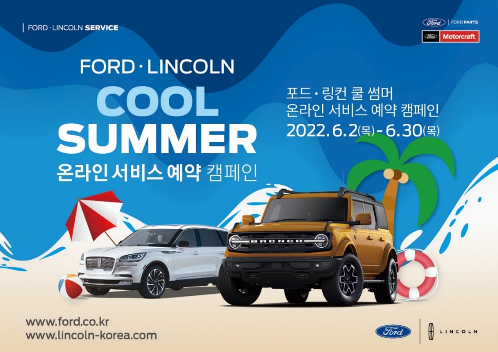 [오토캐스트=강명길 기자] 포드세일즈서비스코리아가 여름시즌을 맞아 '2022 쿨 썸머 온라인서비스예약 캠페인' 차량 점검정비 서비스를 제공한다고 30일 밝혔다. 이는 오는 6월 2일부터 30일까지 한 달간 전국 33개 포드·링컨 공식 딜러사 서비스센터에서 실시한다. 대상은 포드와 링컨 전 차종이다.